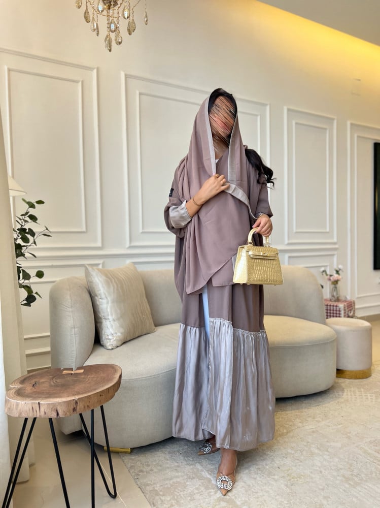 كريب امريكي بيج غامق فراشة مع لمعة لاميه بيج فاتح+طرحة بيج