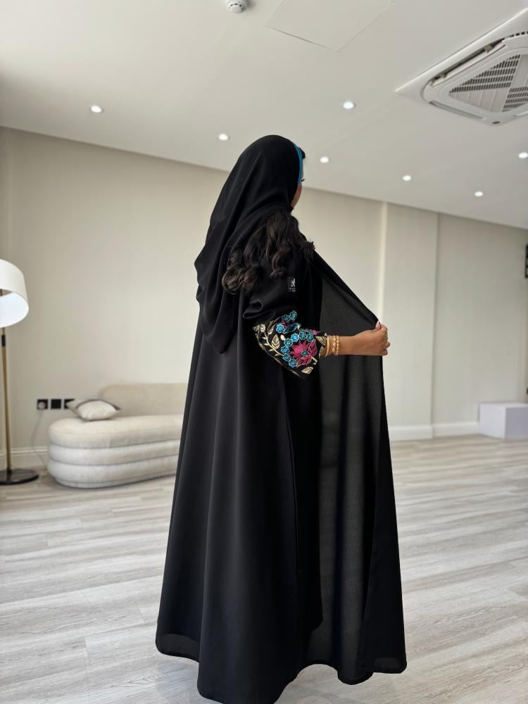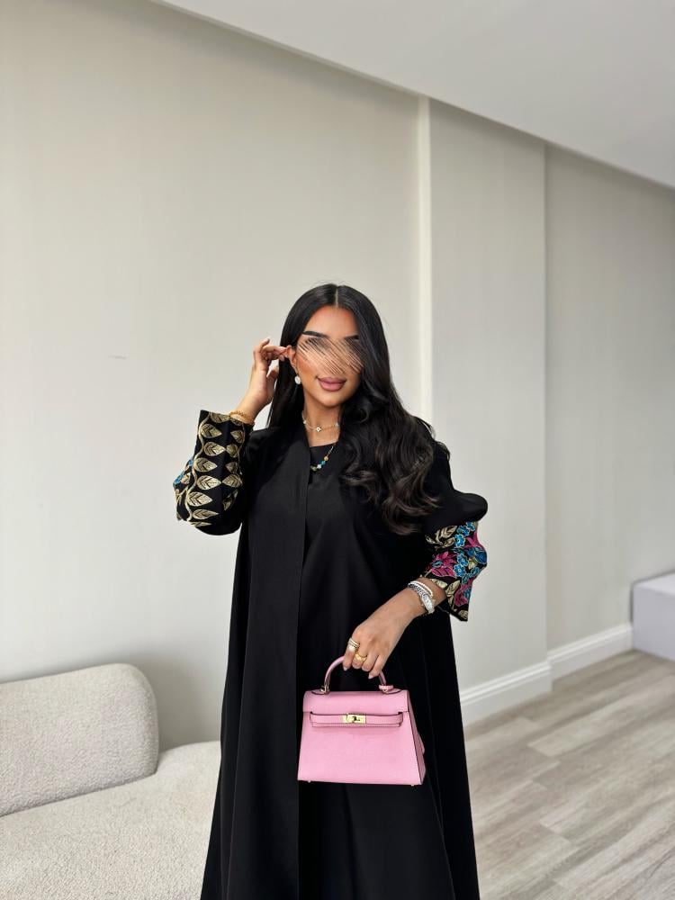 كتان اسود نص كلوش اكمام تطريز + طرحة سوداء