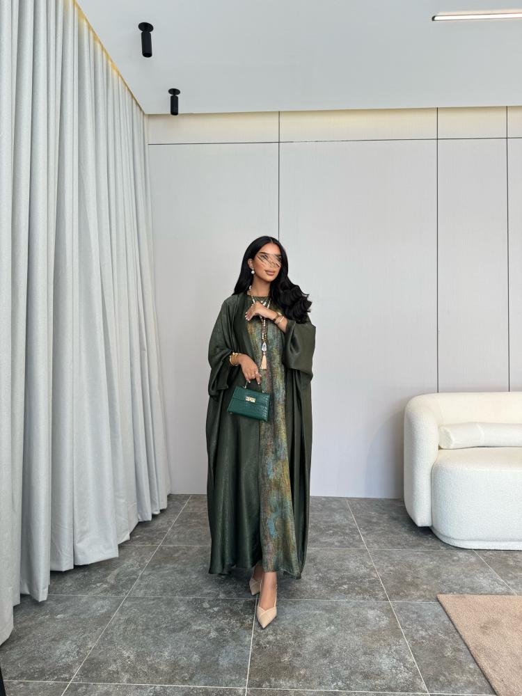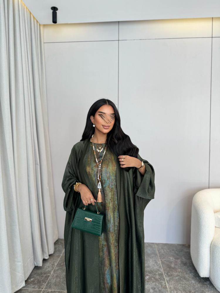 طقم : حرير مغسول لمعة قصة فراشة لون زيتوني غامق+فستان لمعة ملون بذهبي + طرحة زيتي حرير مغسول