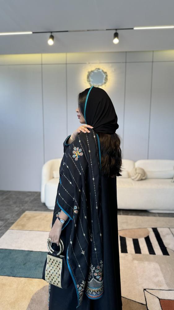 تفتة روسي اسود لمعة مطفي قصة نص كلوش من الأمام ساري تطريز هندي يدوي على شكل طاؤوس ملون + طرحة اسود