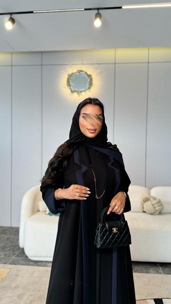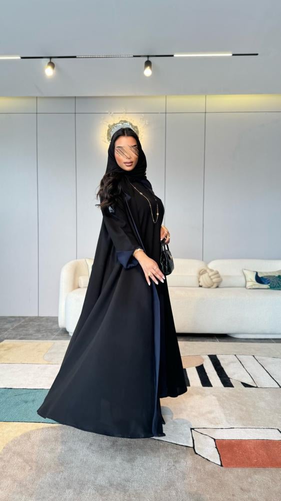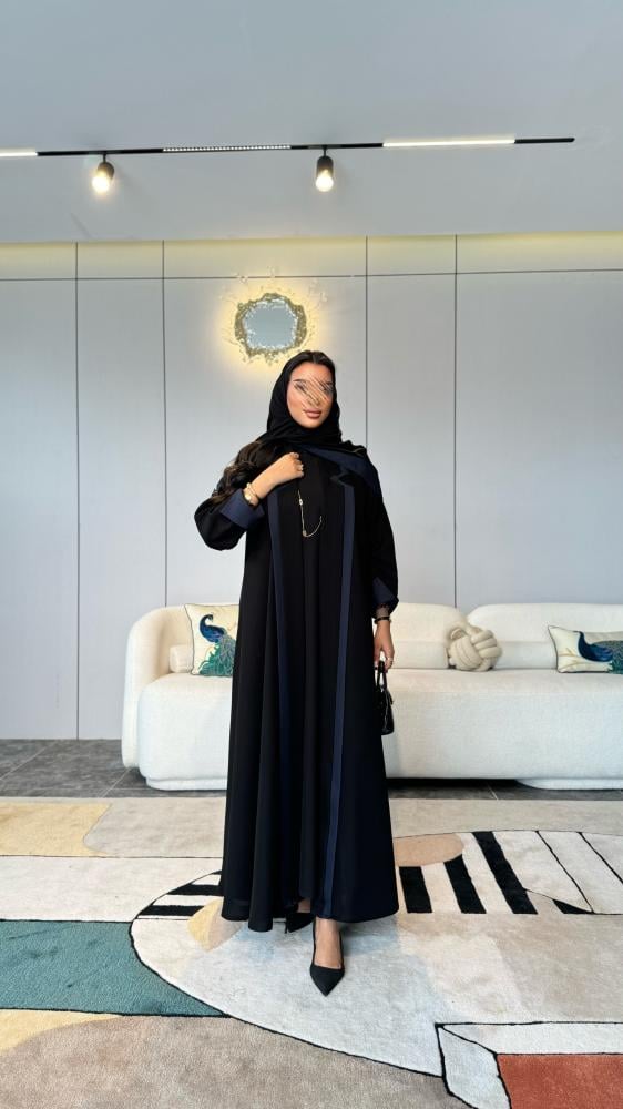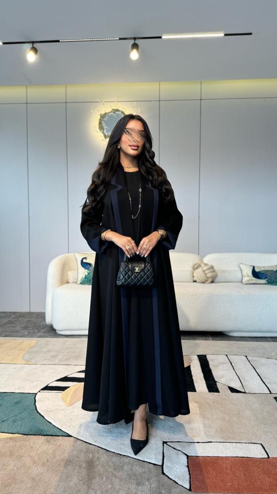 كتان اسود قصة كلوش رسمية من الامام والاكمام كتان لون كحلي + طرحة اسود كتان عريض كحلي