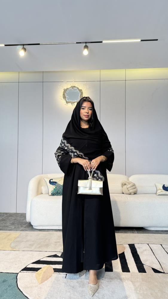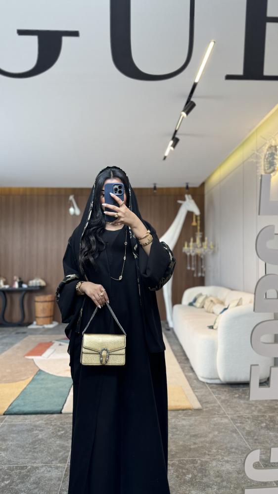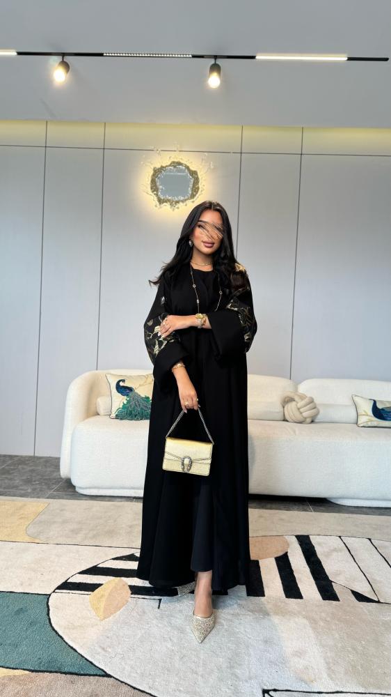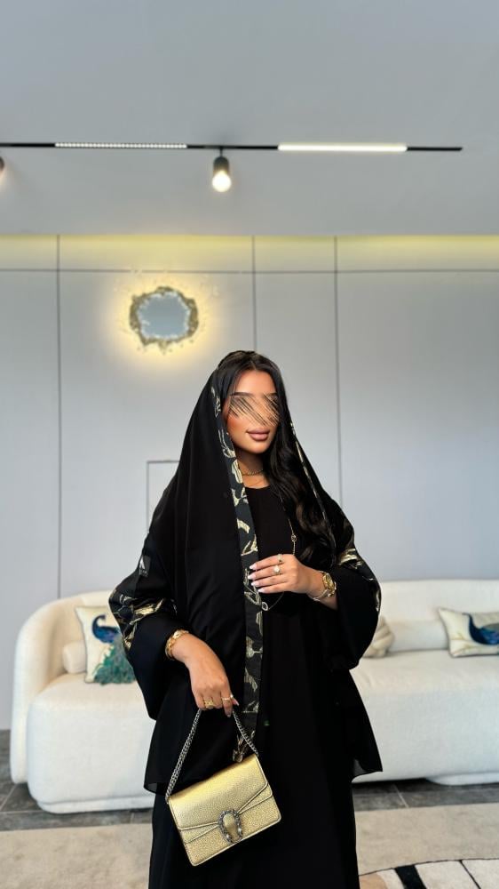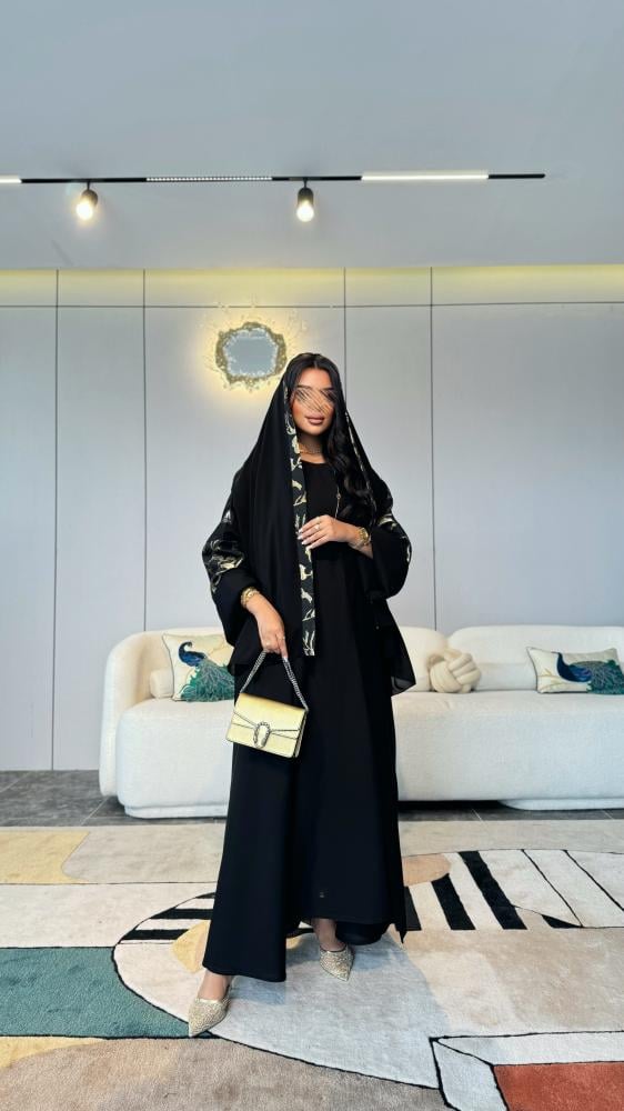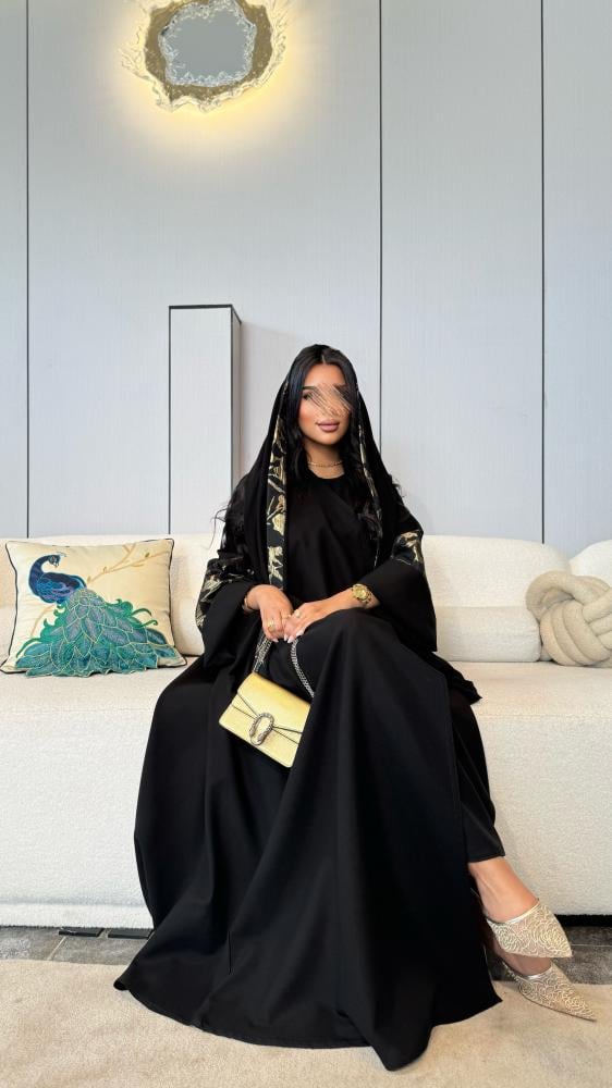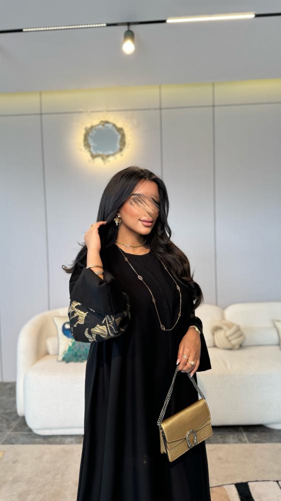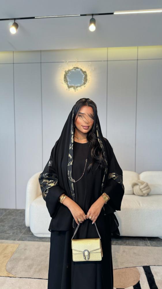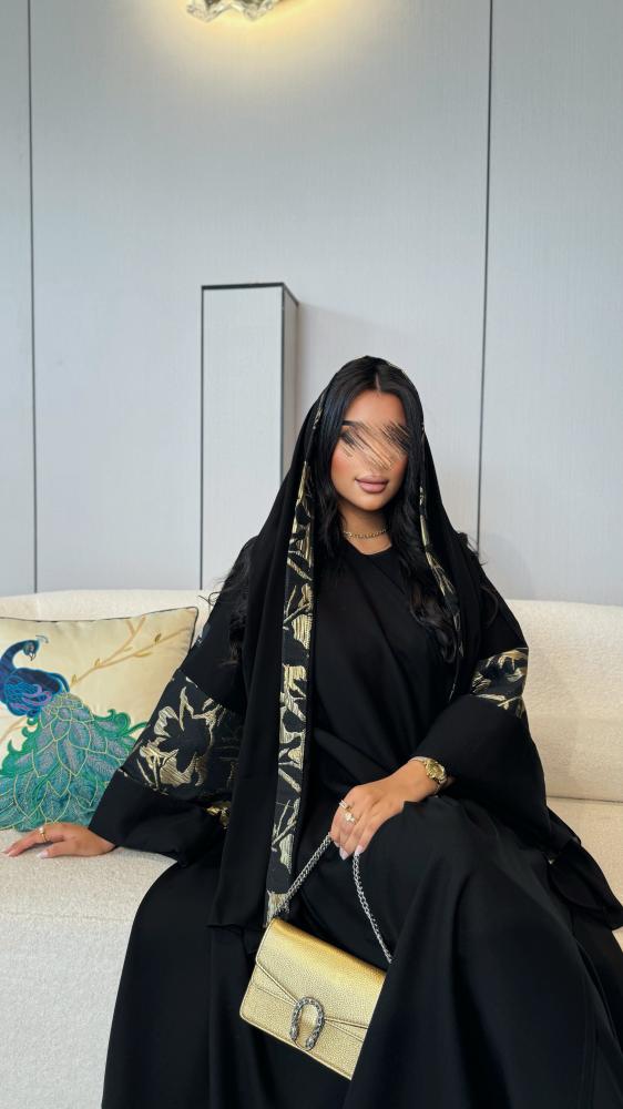 كتان اسود قصة نص كلوش من الأكمام جاكار هندي مورد ذهبي + طرحة اسود