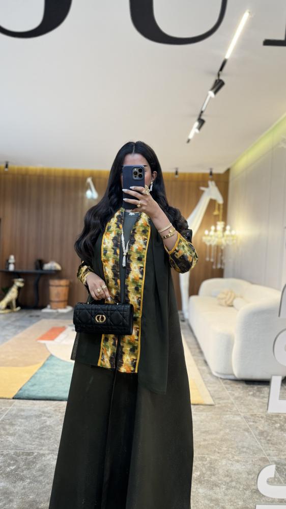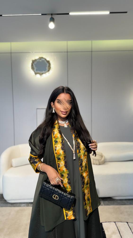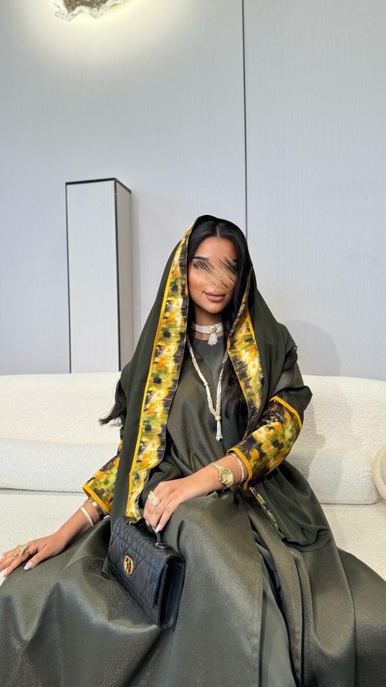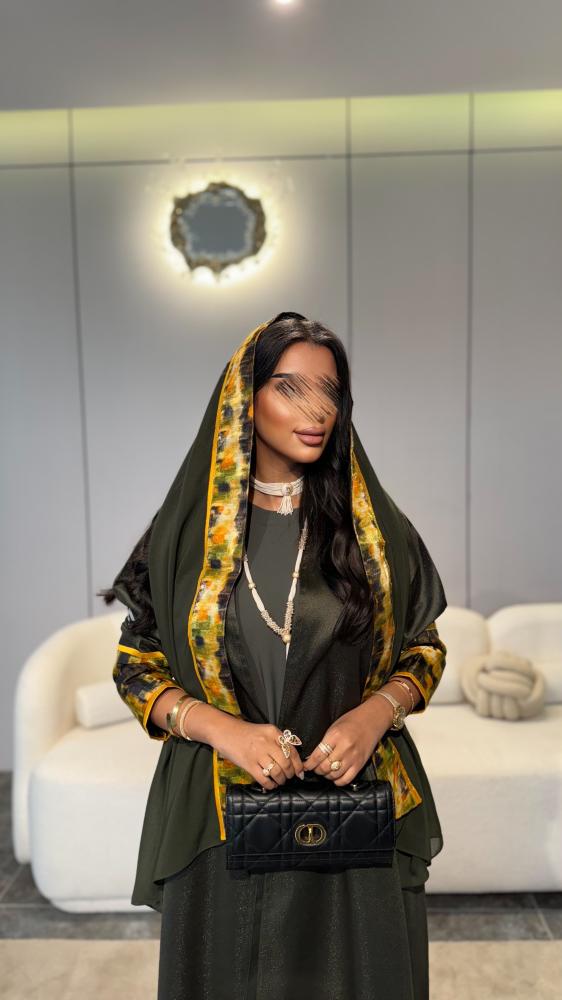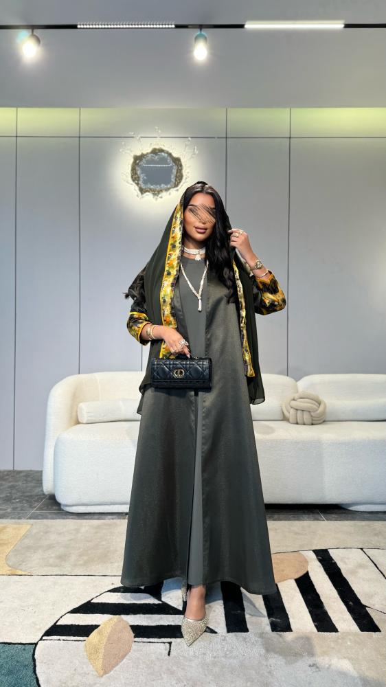 عباية طقم مع فستان : تفتة روسي قصة نص كلوش زيتي غامق مع جاكار في الاكمام اصفر مموج مع اخضر واسود + فستان زيتي فاتح + طرحة زيتي