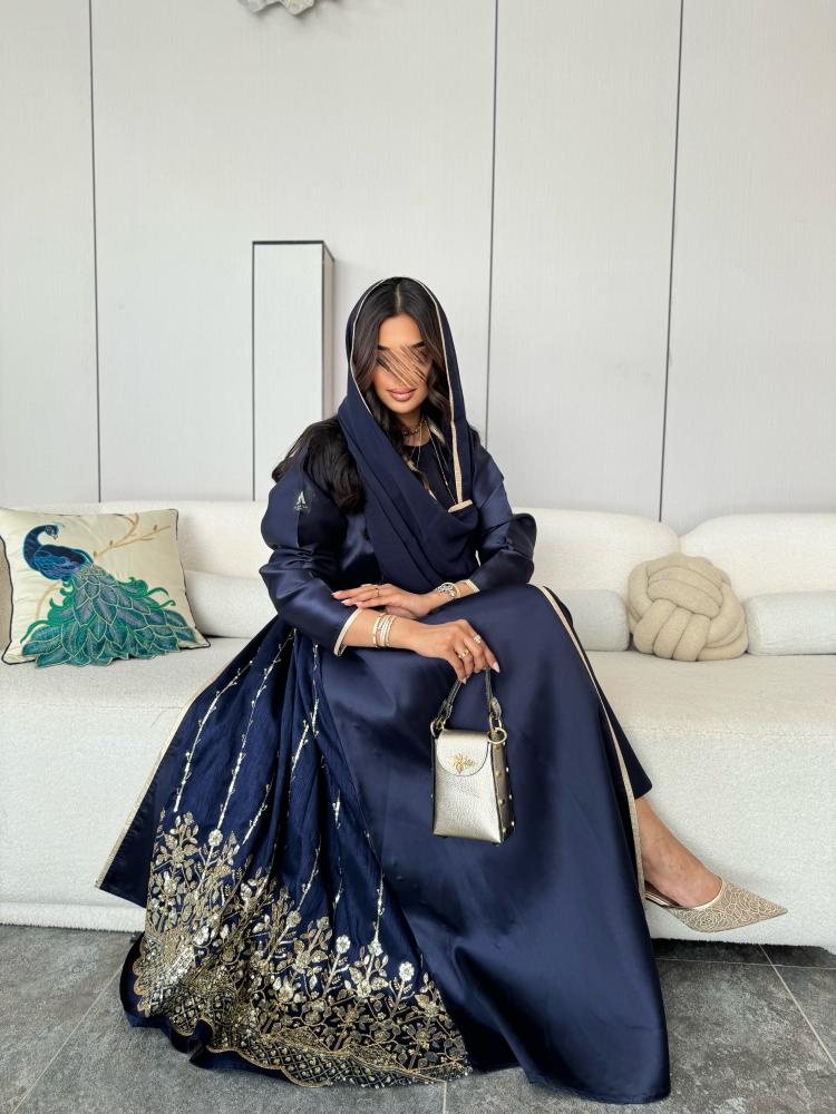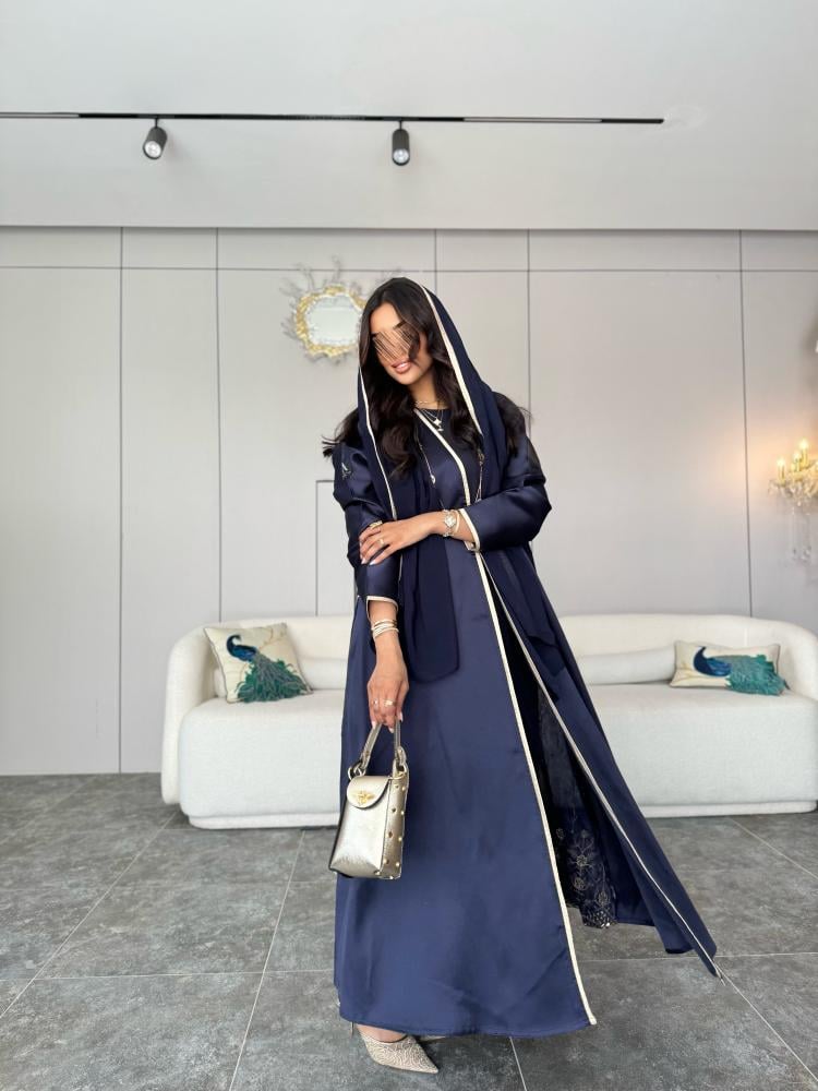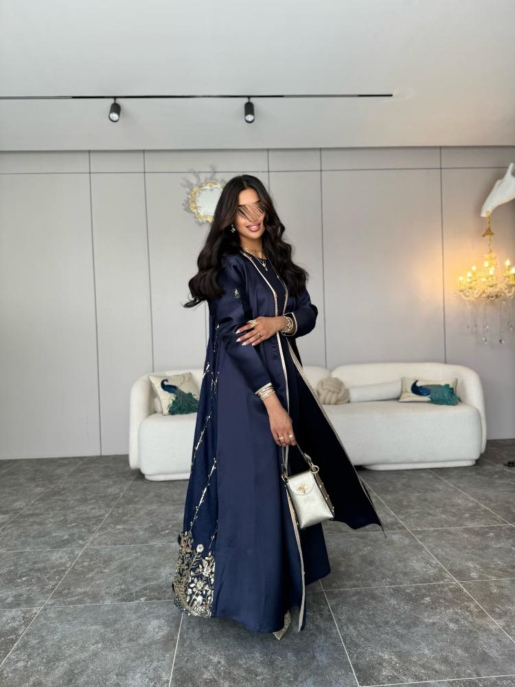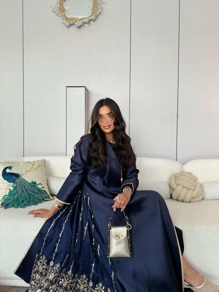 عباية مناسبات : تفتة ميكادو كحلي خامة ثقيلة قصة نص كلوش من الخلف شك يدوي هندي لمعة ترتر + طرحة كلحي