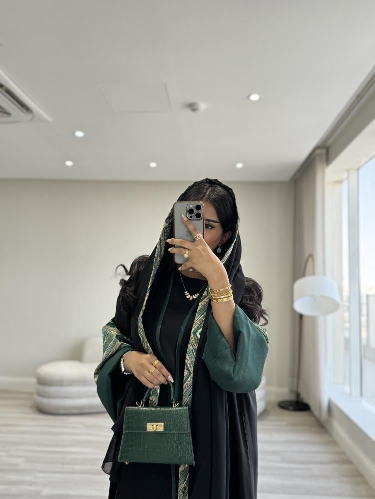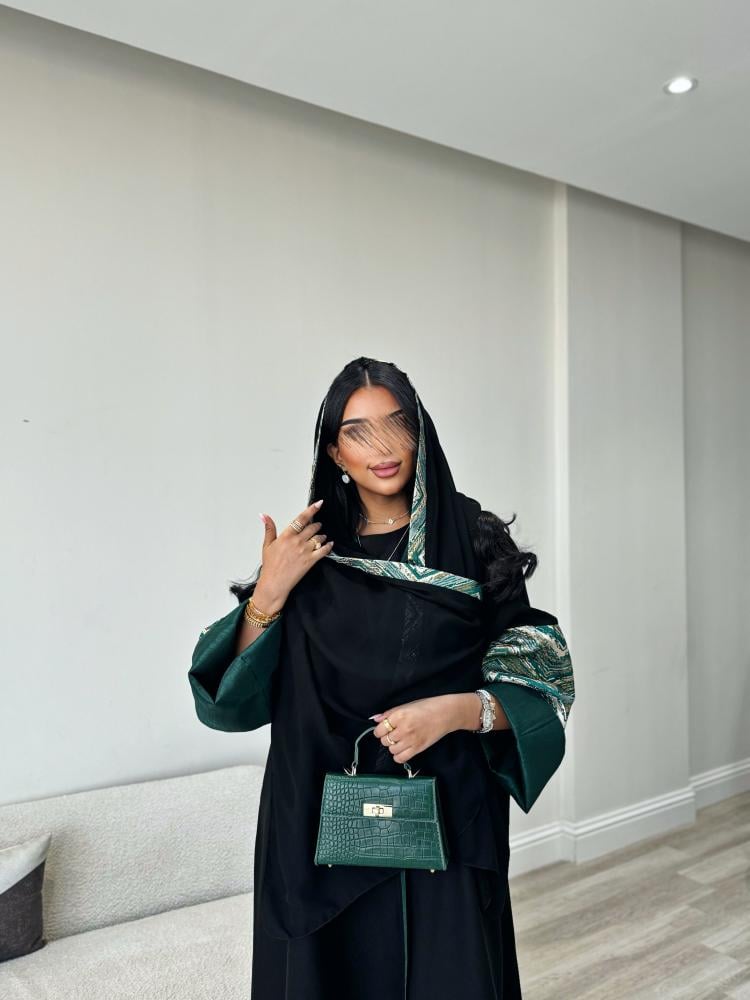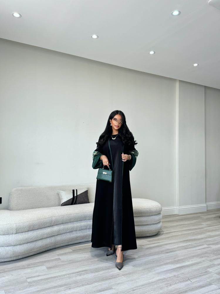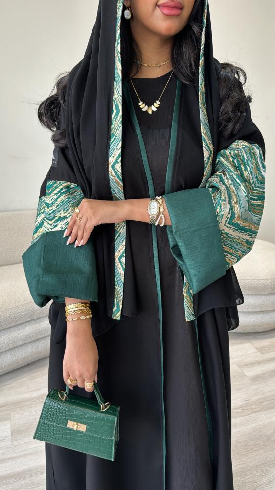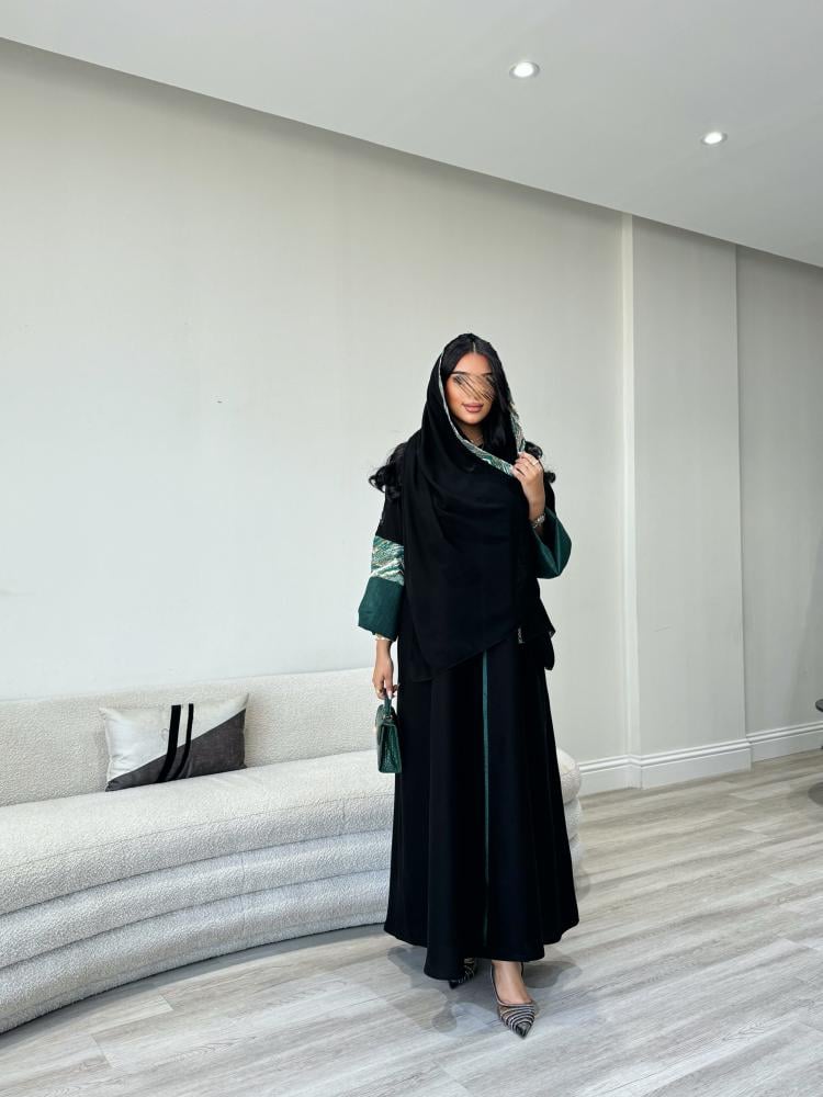 كتان اسود قصة نص كلوش اكمام جاكار مموج مع شانتون اخضر + طرحة سوداء
