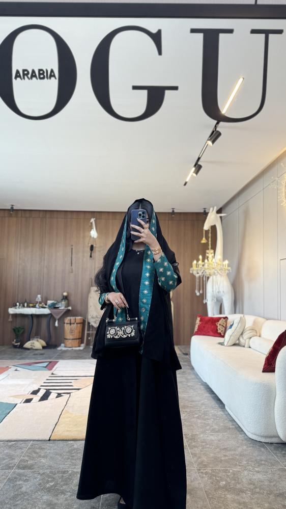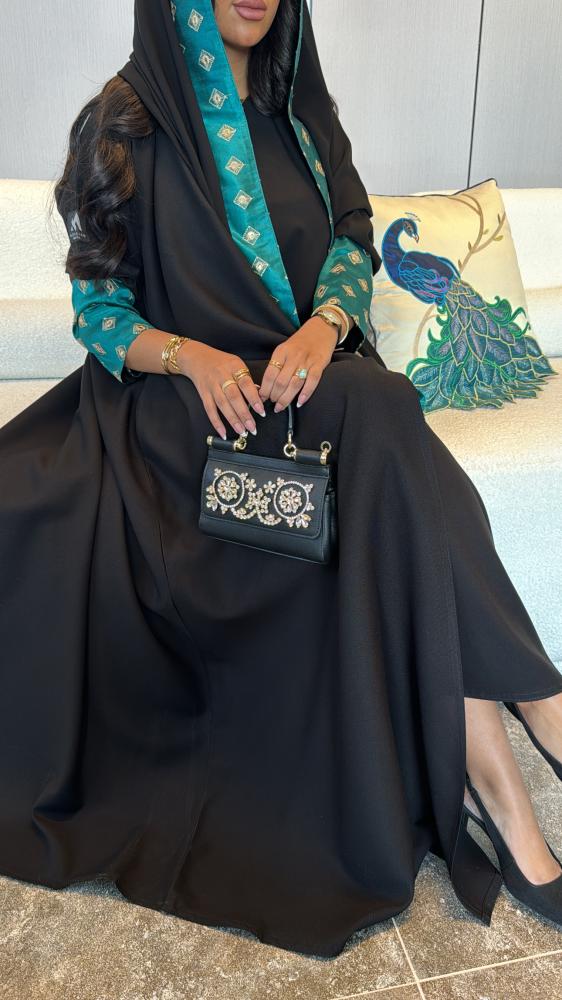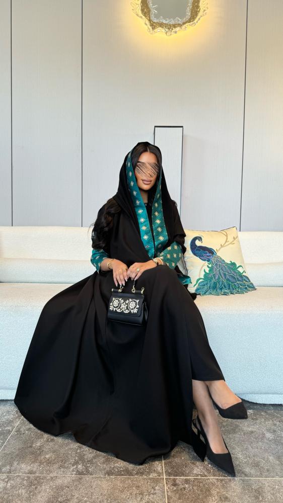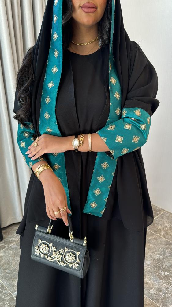 كتان اسود قصة نص كلوش اكمام شانتون هندي تركواز وذهبي على شكل معينات + طرحة اسود