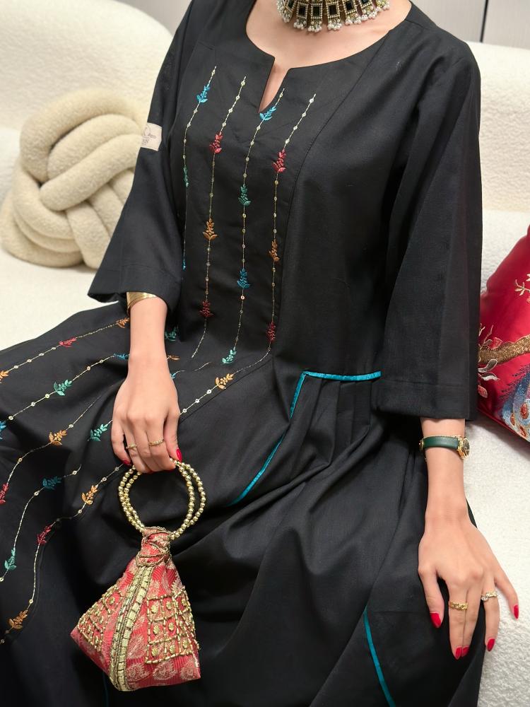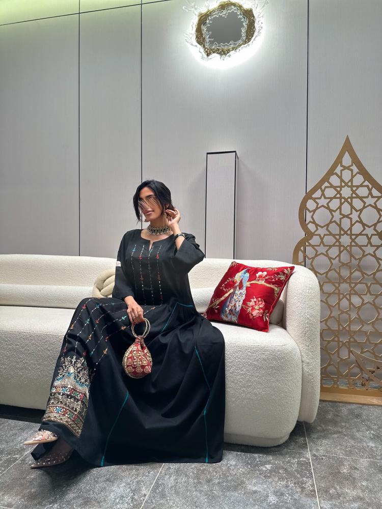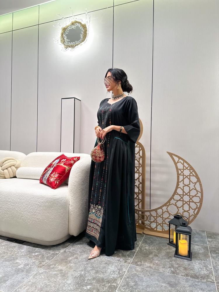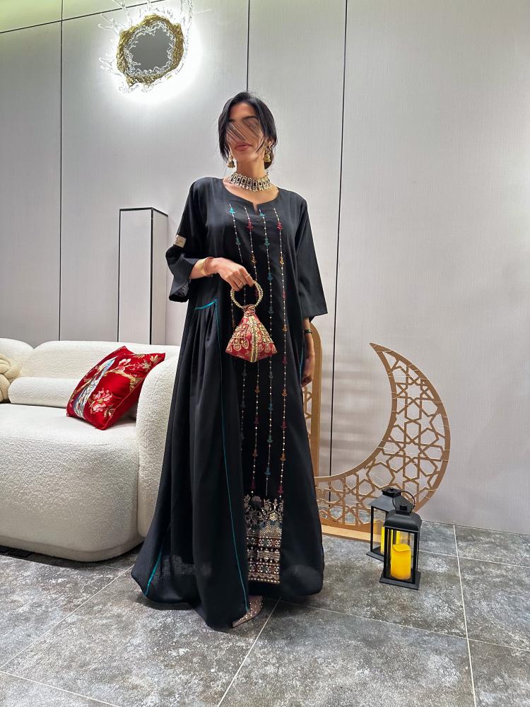 بالتعاون مع براند كيان بوتيك جلابية لنن هندي لون اسود قصة ربع كلوش من الامام كلفة هندي ملون مع ذهبي + اكسسوار شعر لؤلؤ قطعتين مجاناً