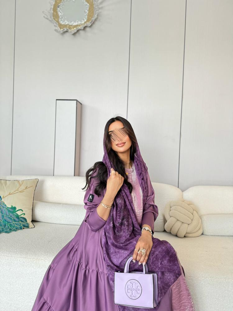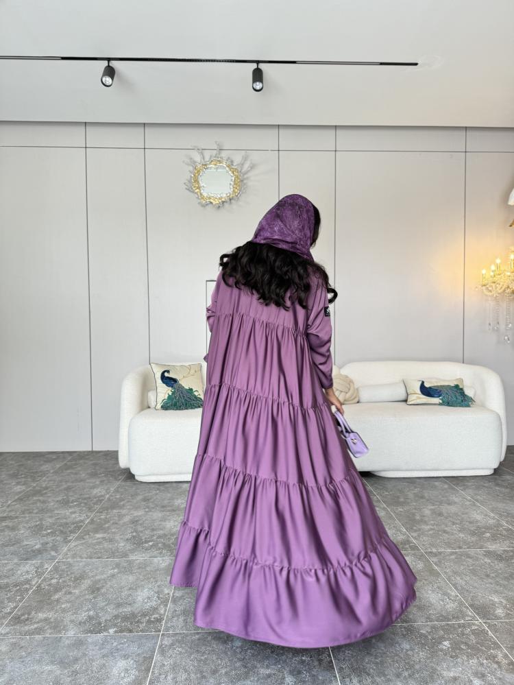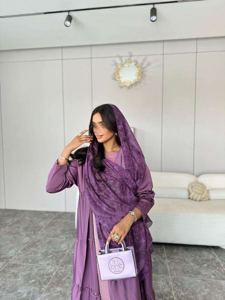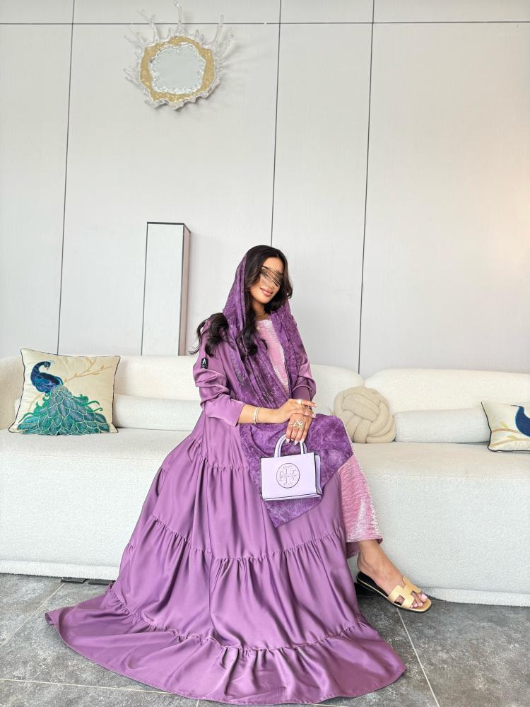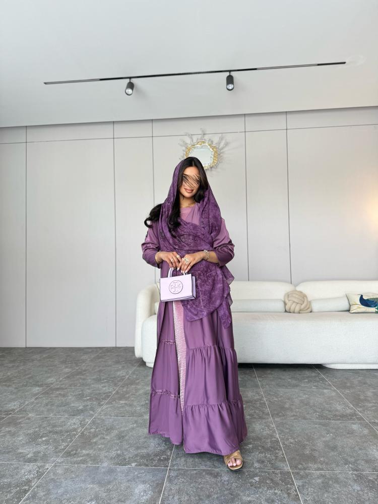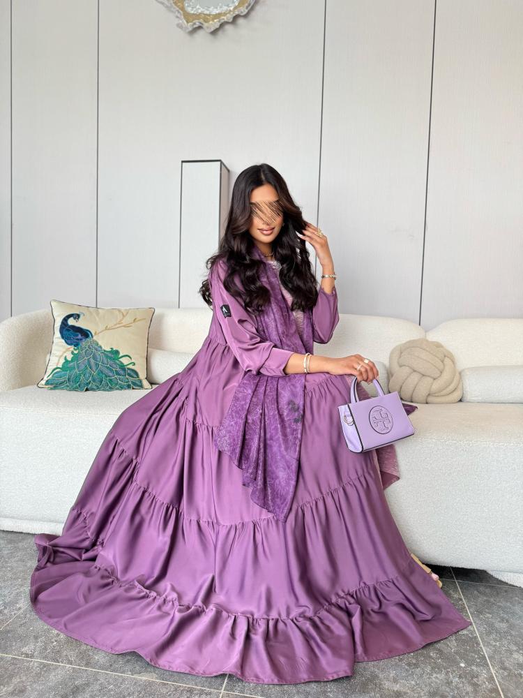 كريب حرير موف فاتح قصة كلوش كامل طبقات + طرحة شيفون مموجة لمعة لون موف